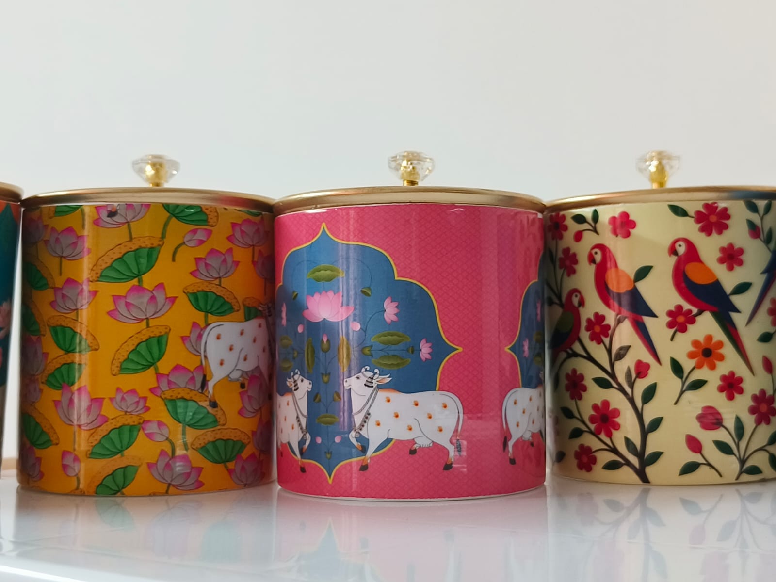 6 × Metal Digital Printed Pillar Jars (5x4 inches, 500 ml capacity each) with crystal knob lids